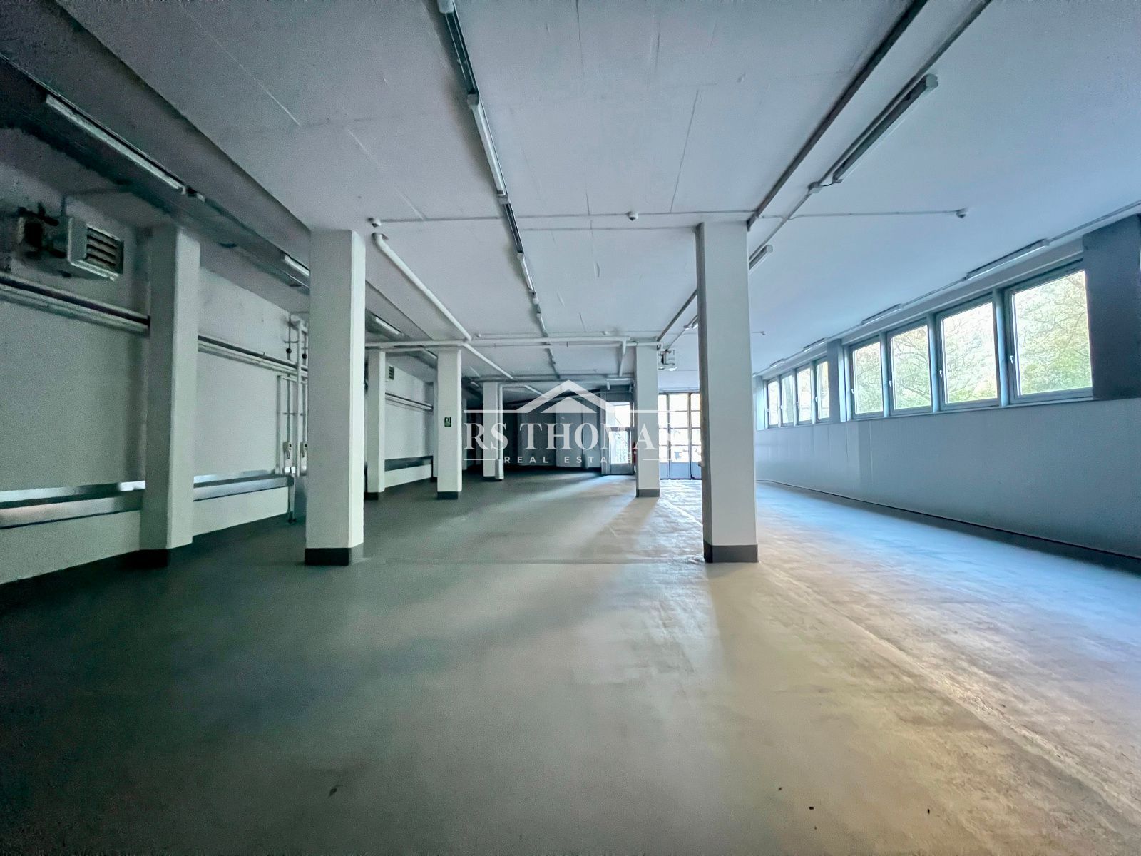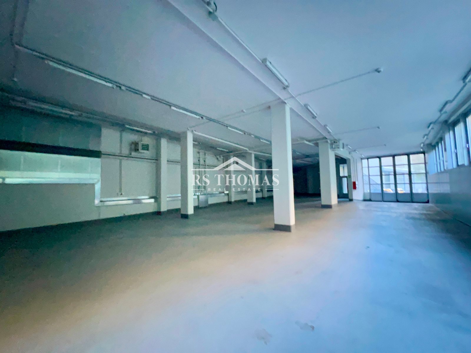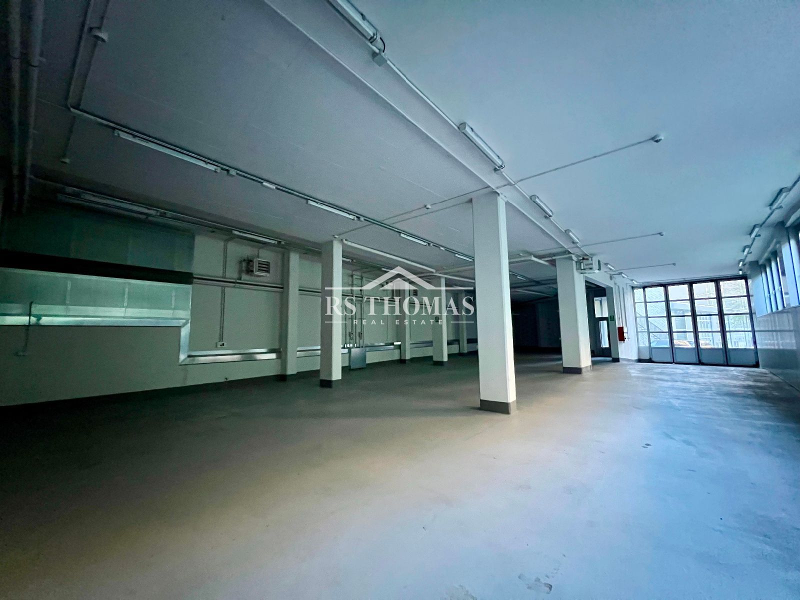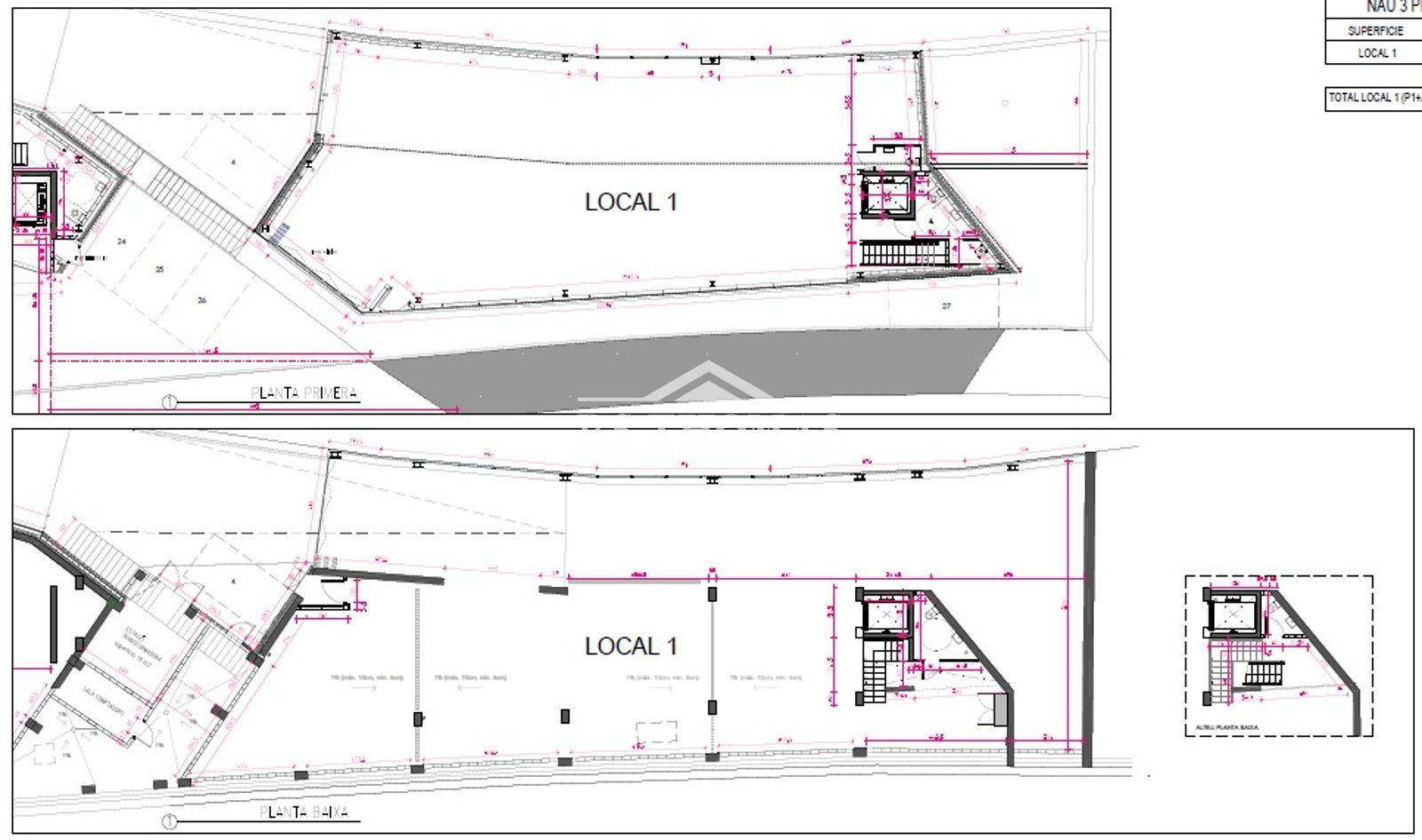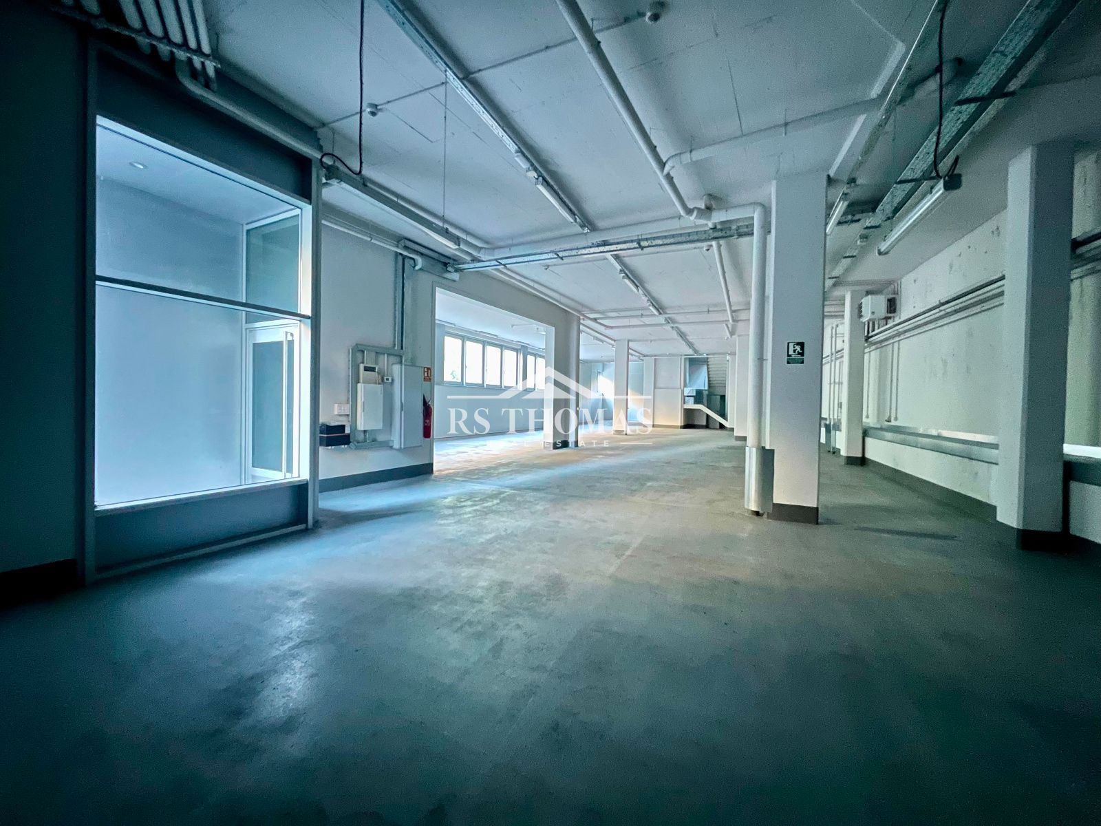 - Planta principal (a nivell de carrer): espai diàfan de 345,81 m², amb dues sales condicionades com a despatxos (11,27 m² cadascuna), un bany i muntacàrregues. La porta d'entrada fa 4,28 m d'alçada i 4,17 m d'amplada.