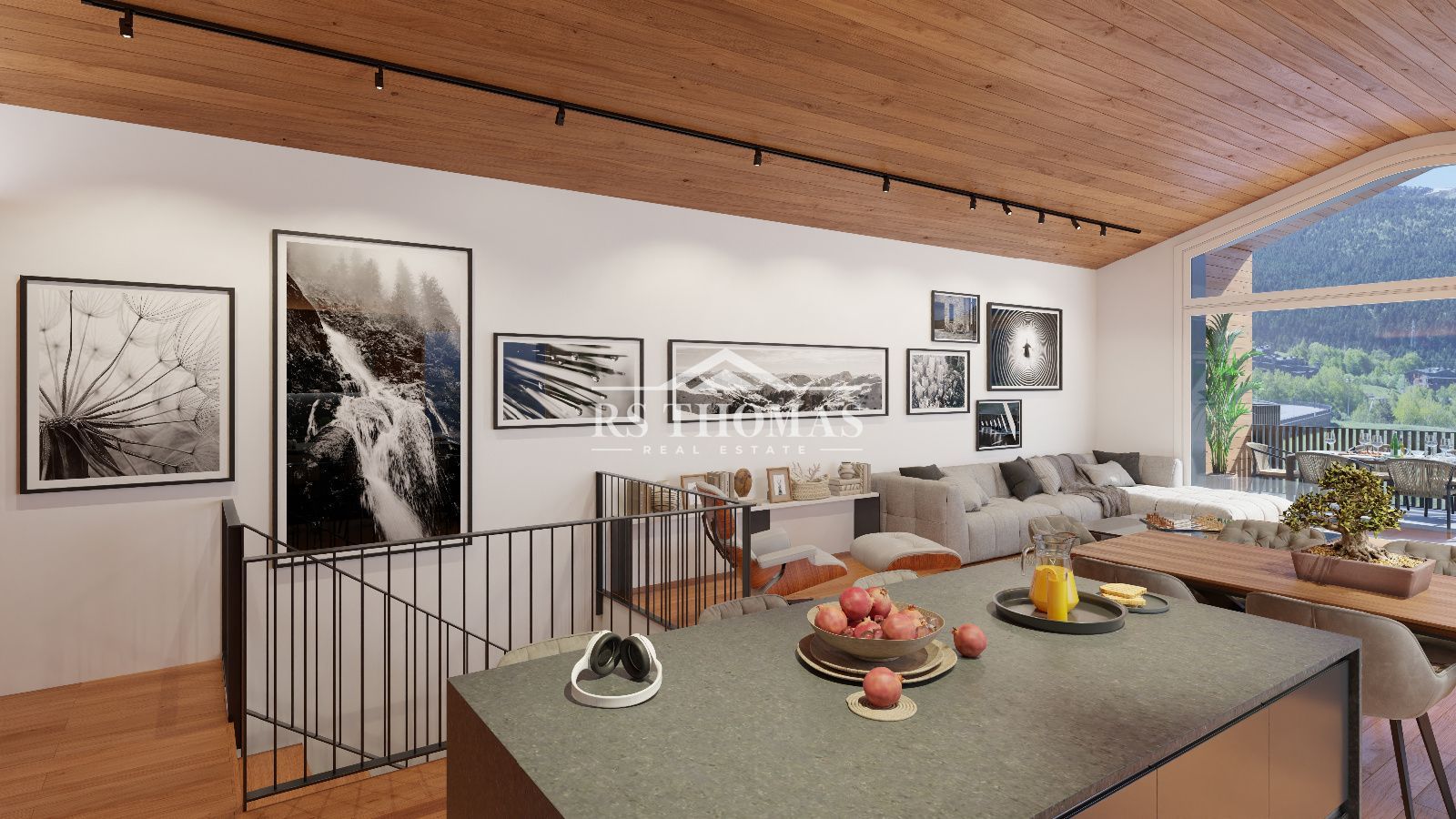 La planta superior de la propiedad está destinada a la zona de día donde tenemos una amplia cocina totalmente equipada con electrodomésticos de alta gama integrada al salón-comedor con una fantástica chimenea. Desde el comedor tenemos acceso a una bonita terraza que nos ofrecerá unas increíbles vistas a las pistas de esquí y a las montañas. Esta zona se complementa con un aseo de cortesía y un espacio para la lavandería.