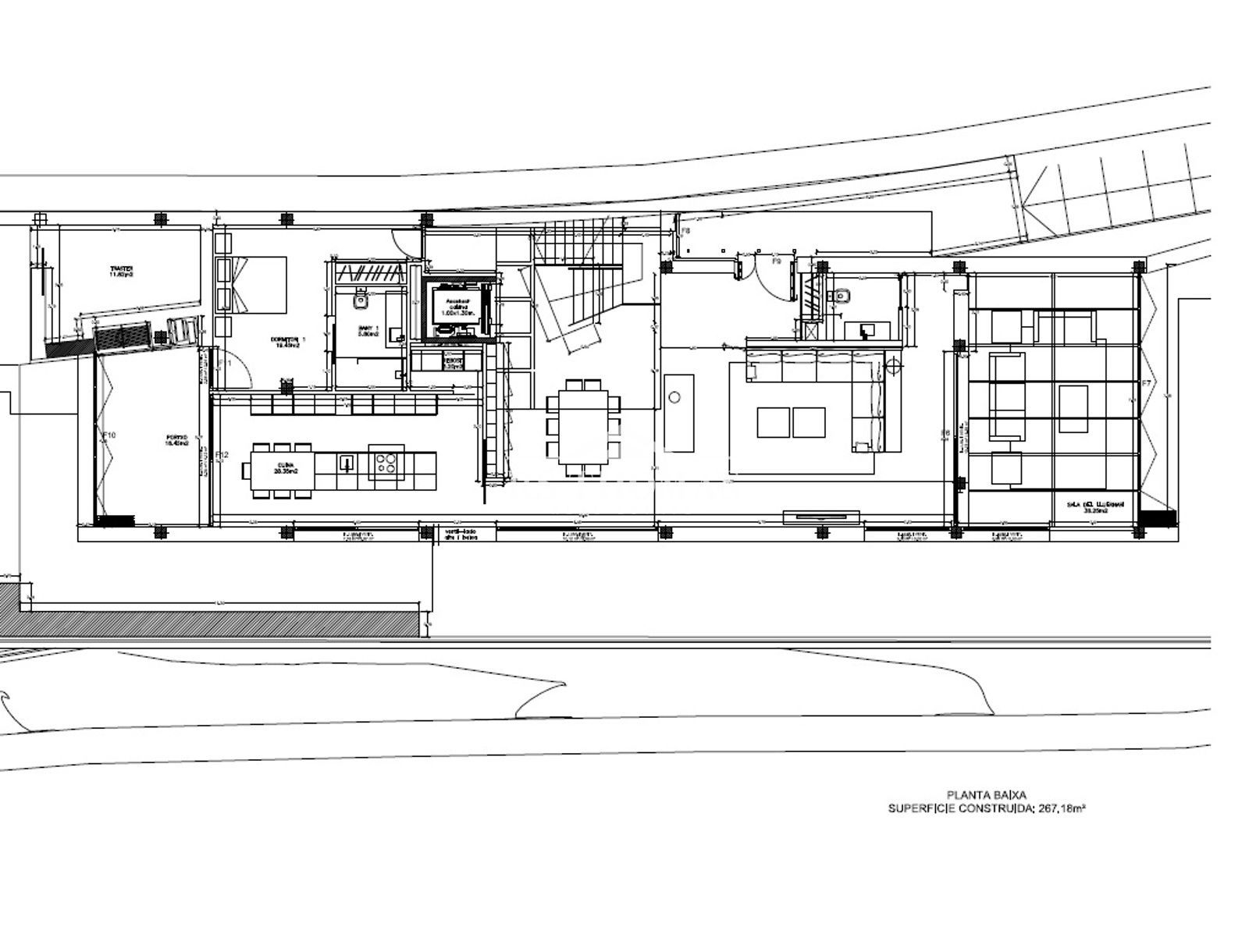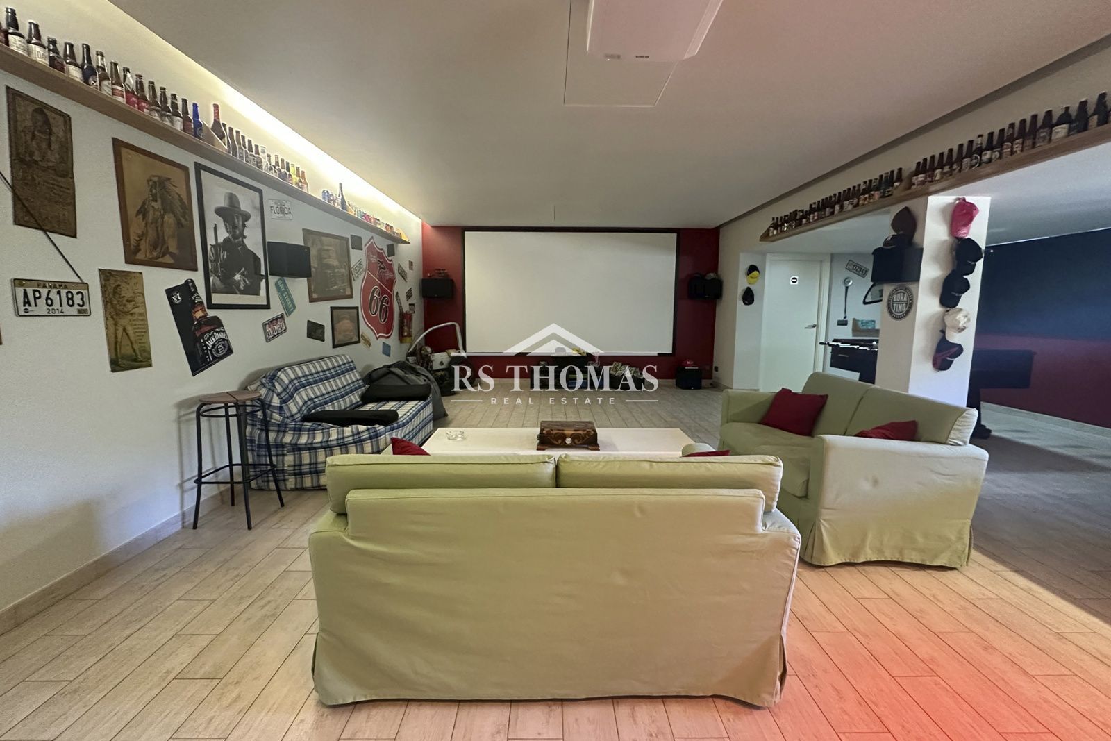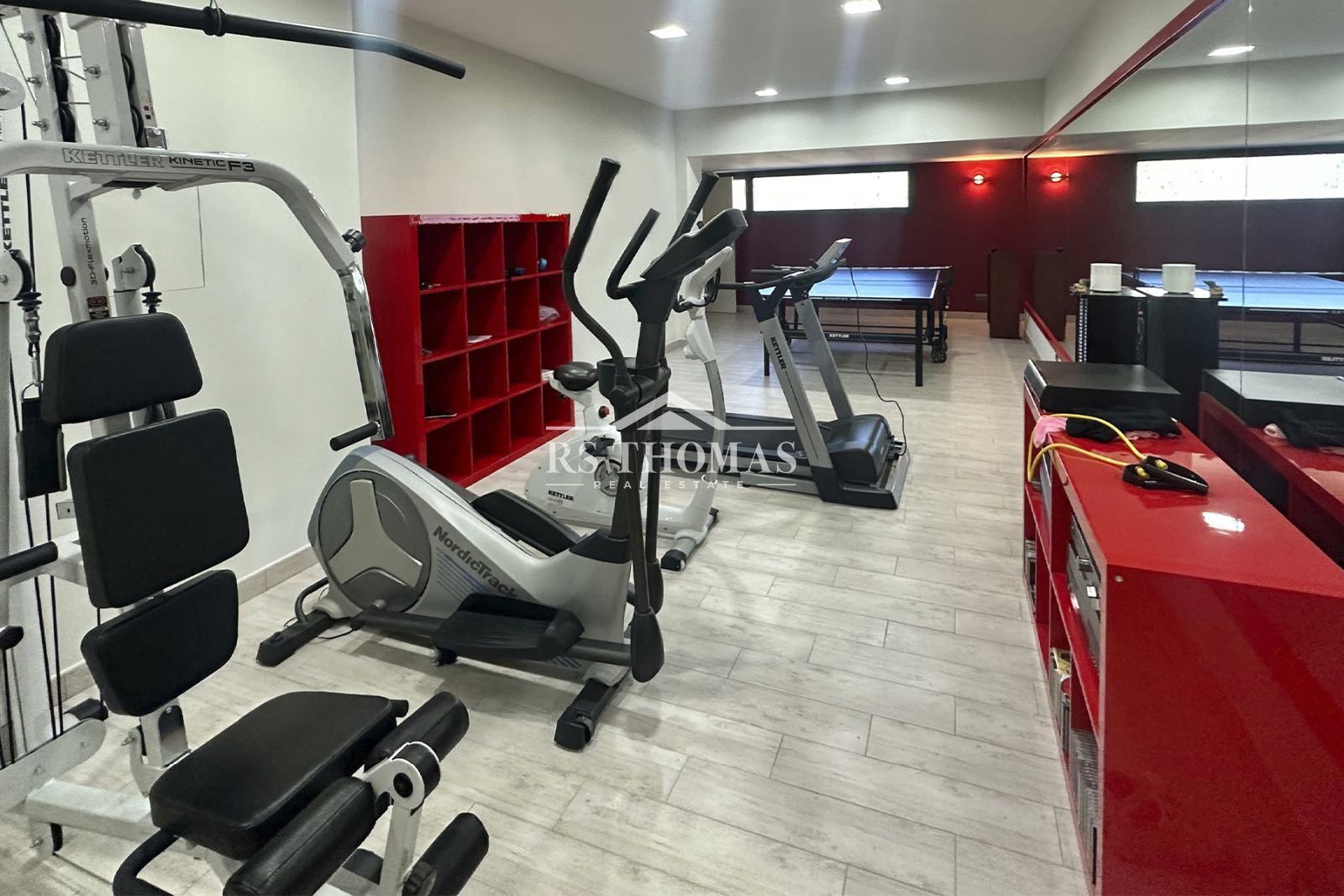 Por la planta baja tenemos el acceso a esta exclusiva propiedad donde vemos un amplio garaje con capacidad para más de 10 vehículos, un gimnasio equipado, una pre-instalación para la sauna, una sala de juegos, una sala polivalente, un aseo, una sala de estar equipada con home-cinema y una fabulosa zona de bar y salida al jardín exterior donde encontramos un jacuzzi. En esta zona también encontramos la sala de máquinas de la vivienda.